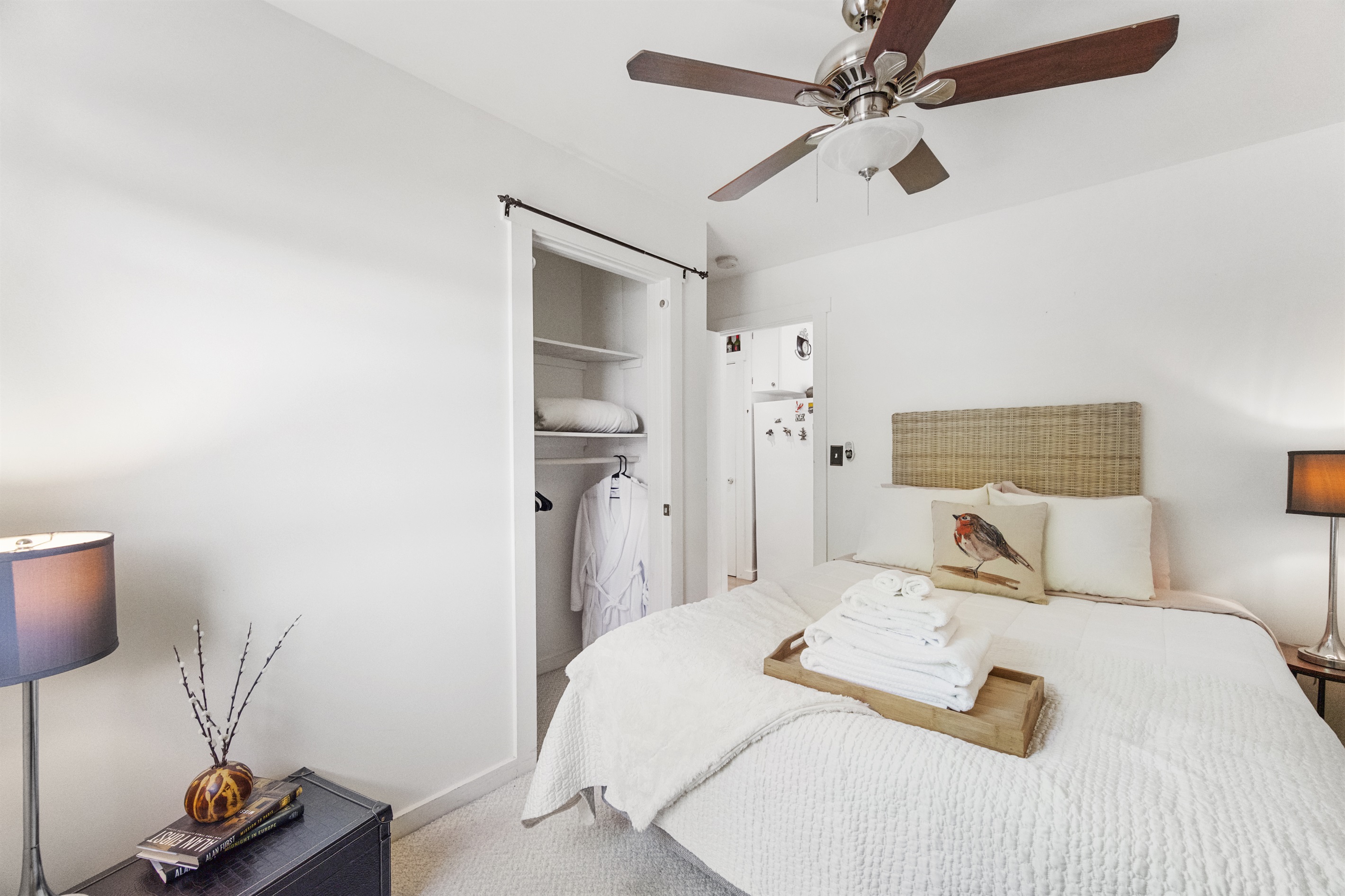 Each bedroom has a high quality Queen sized Tempur-Pedic brand memory foam mattress. There’s a closet for each room for your hanging clothes and other belongings. You’ll also find bath linens provided in each bedroom closet. Both bedrooms have ceiling fans with light kits and wall mounted A.C. Units with remote controls.COZY OPEN LOFT -