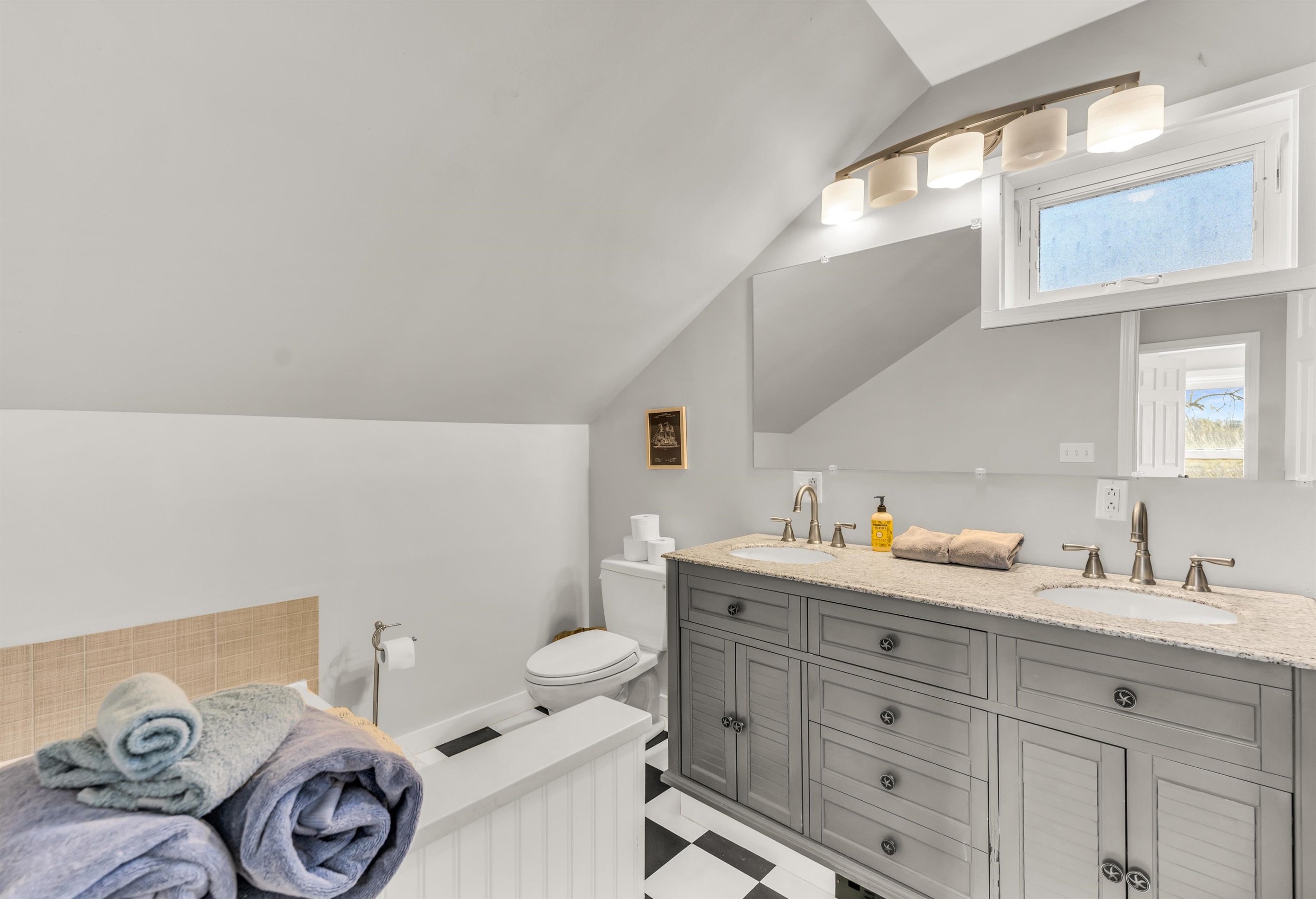 Bathroom 2: Second-floor bathroom featuring both a tub and a separate shower.Downstairs Living Room: Two twin trundle beds and combine for a king bed, and a couch