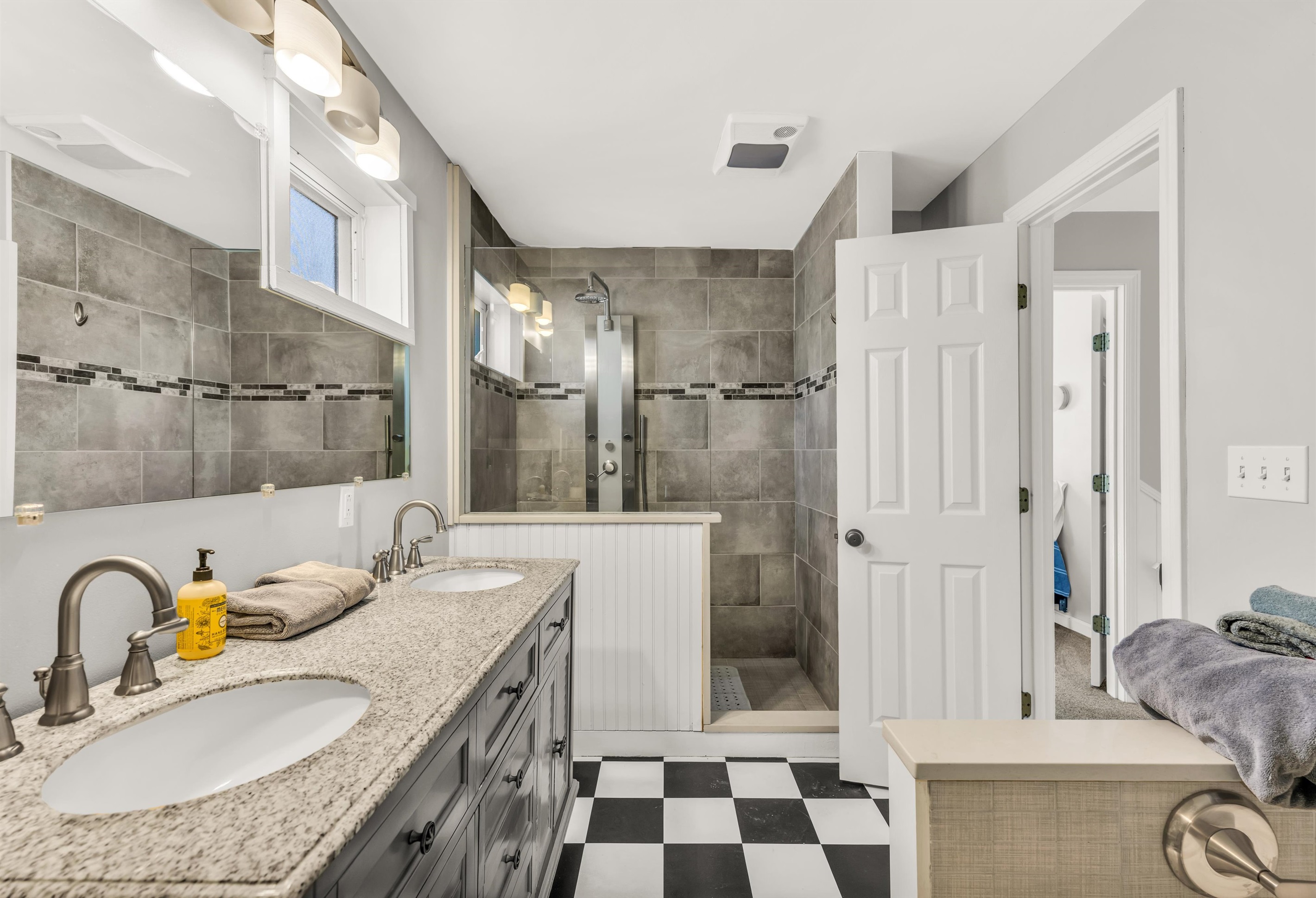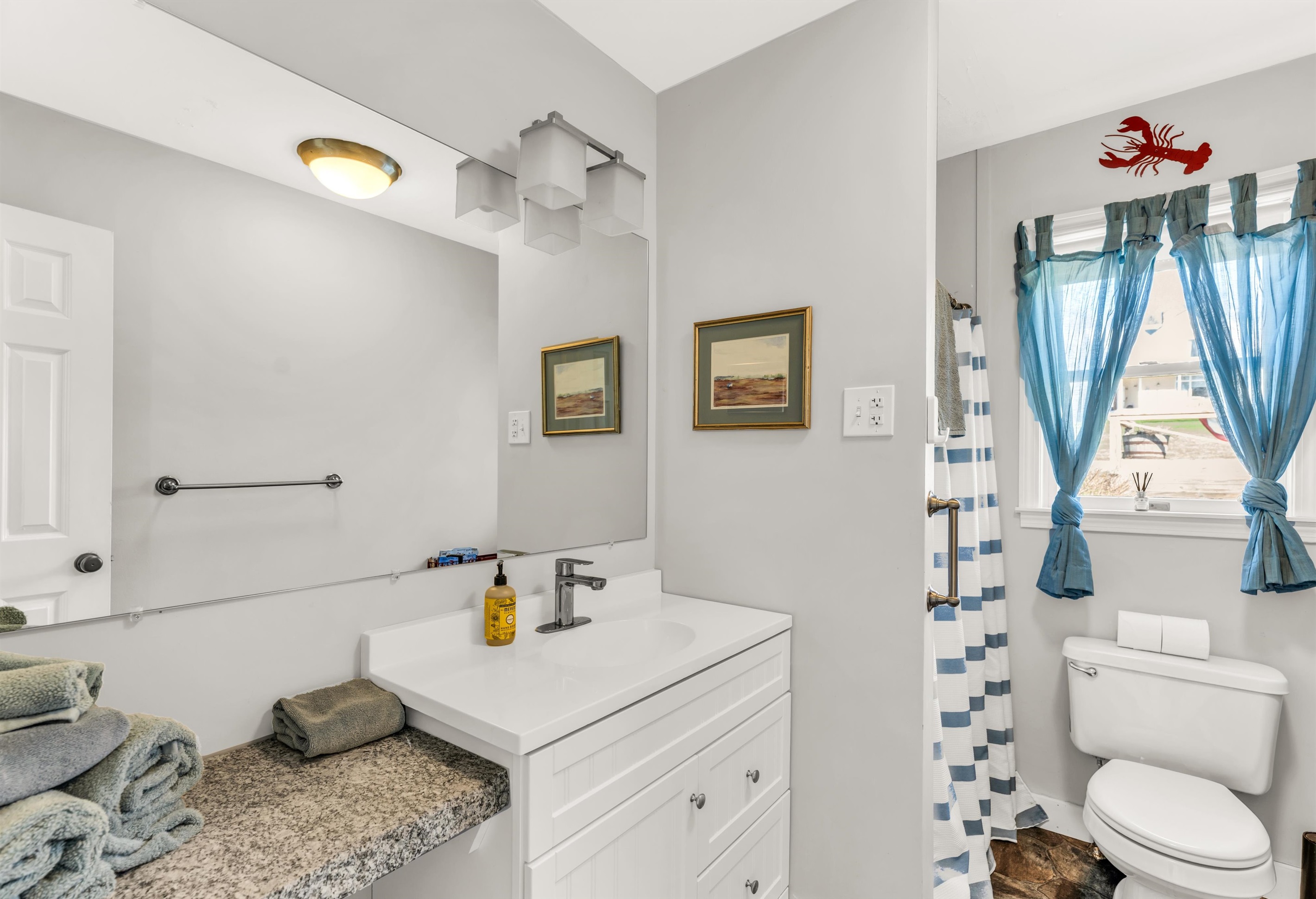 Bathroom 1: First floor full bathroom with a bright and airy feel, featuring a tub and shower combination, a modern white vanity with plenty of storage, and a large mirror.