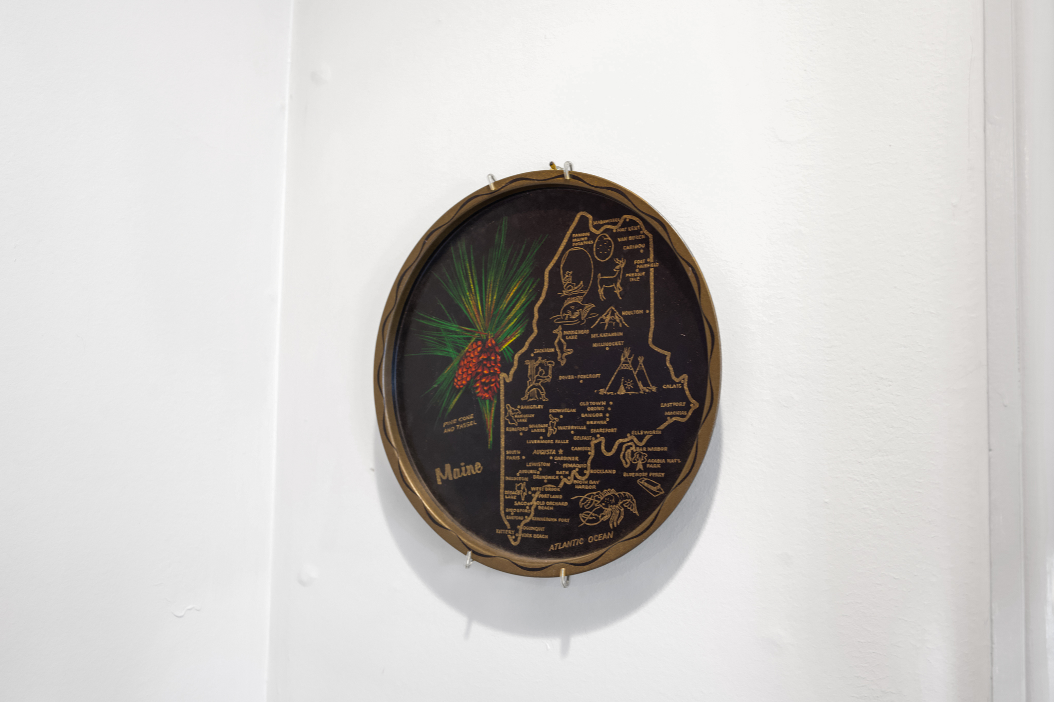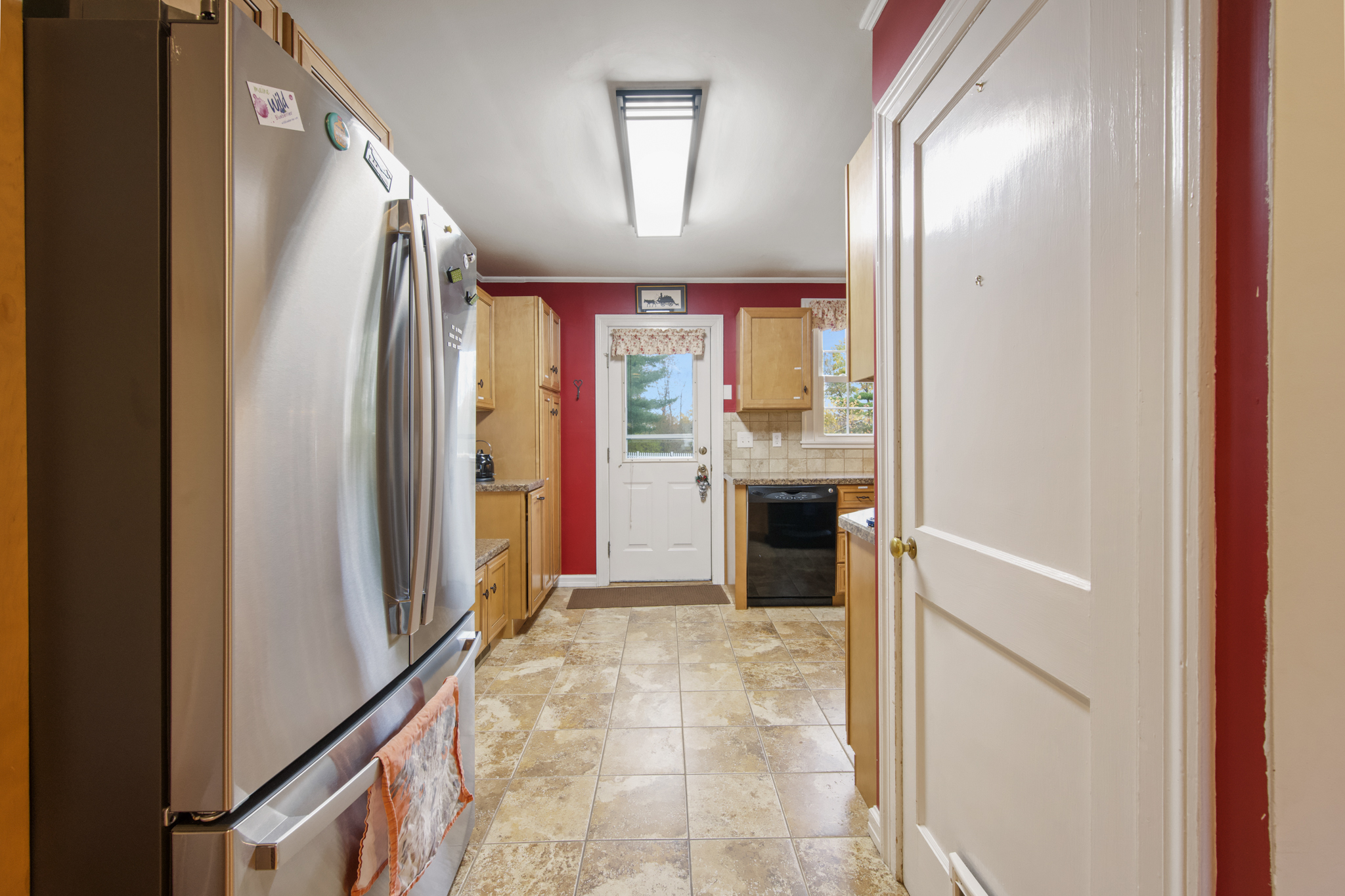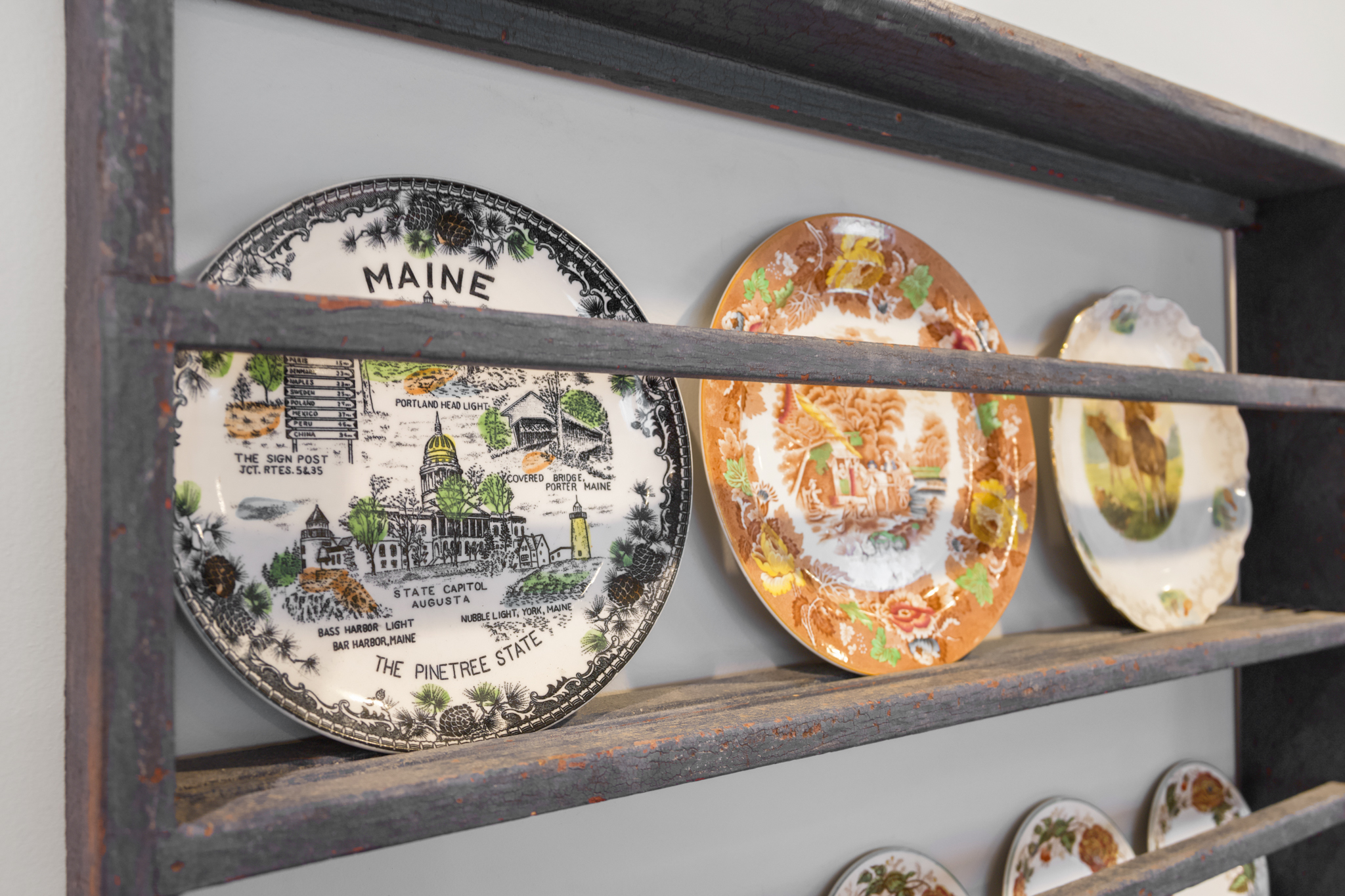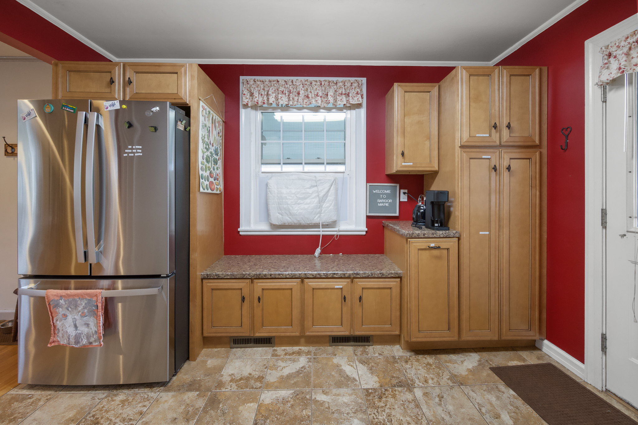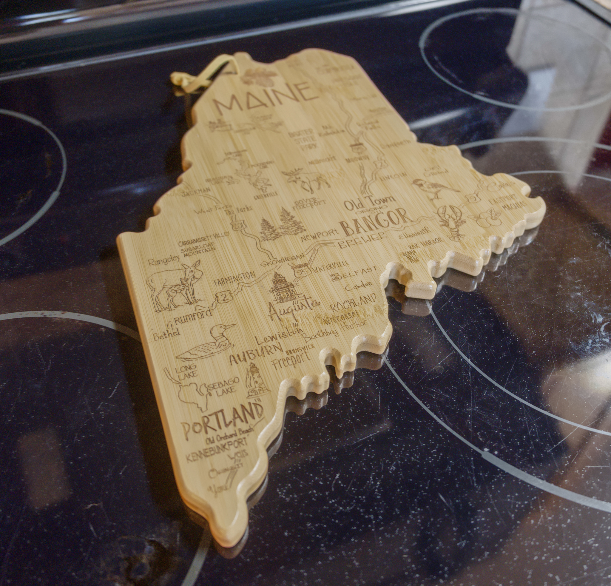 The kitchen features a cozy Maine natural food theme with red walls, artwork of farmers, slate boards, a Maine-shaped cutting board, antique vegetable posters, and loon-themed towels. It’s fully stocked with essentials like a stove, oven, refrigerator with ice and water dispenser, microwave, toaster oven, double sink with disposal, electric kettle, blender, griddle, waffle maker, bakeware, utensils, pans, lobster forks, and fiestaware dishes.