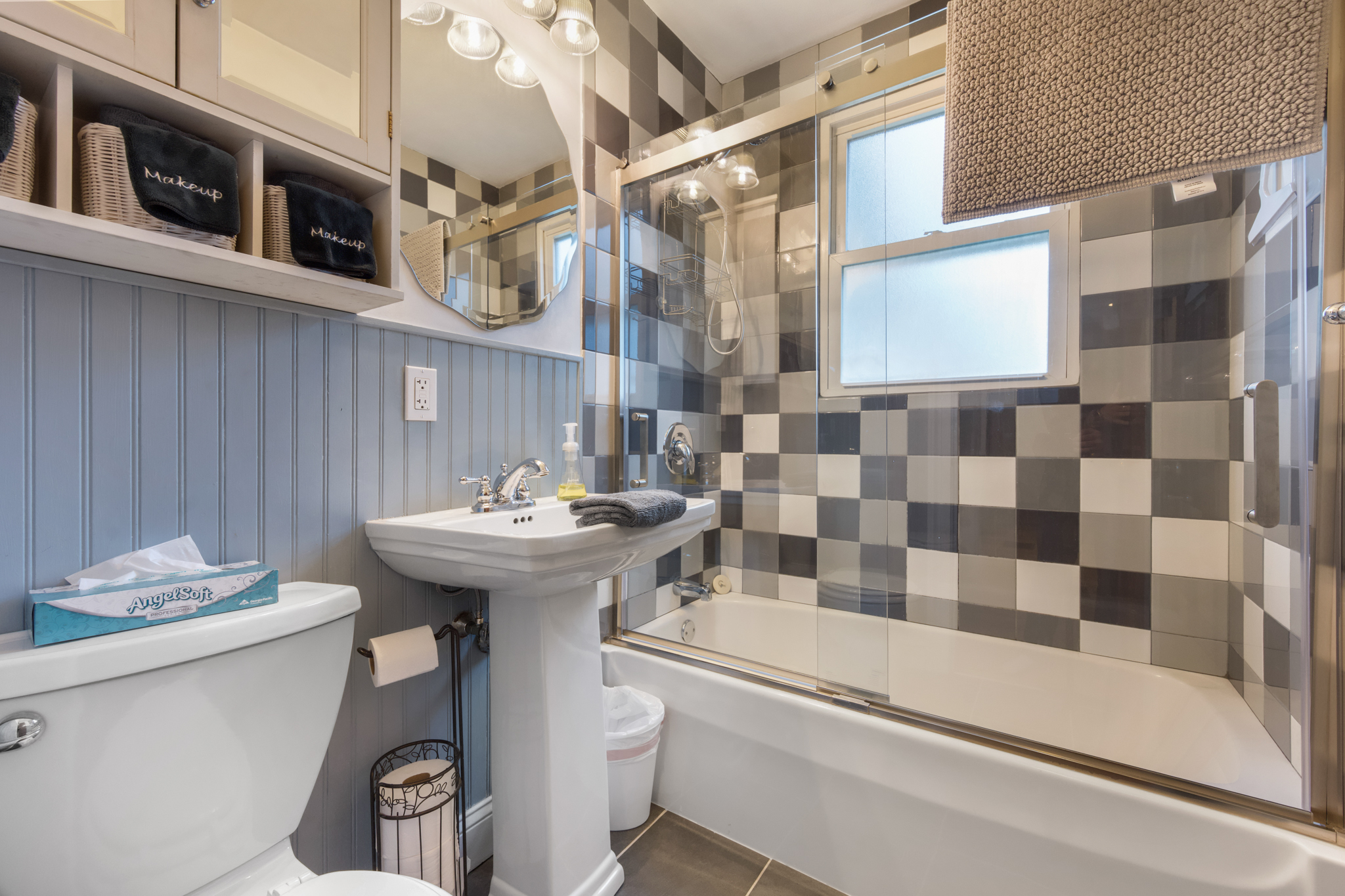 1st floor bathroom: 1 full bath with shower/tub combo, shelves, towels, mirror, and complimentary shampoo, conditioner, and body wash.KITCHEN:
