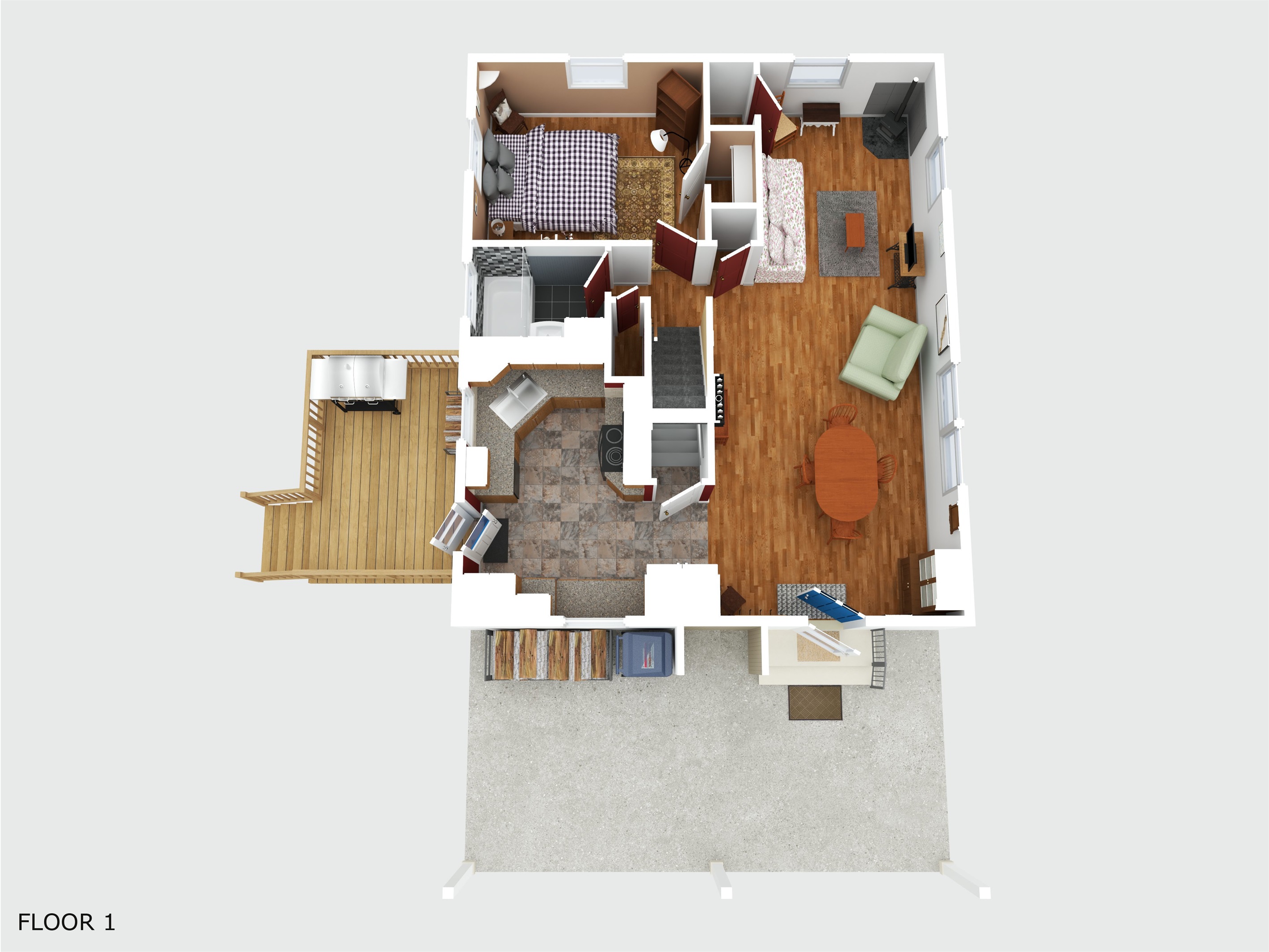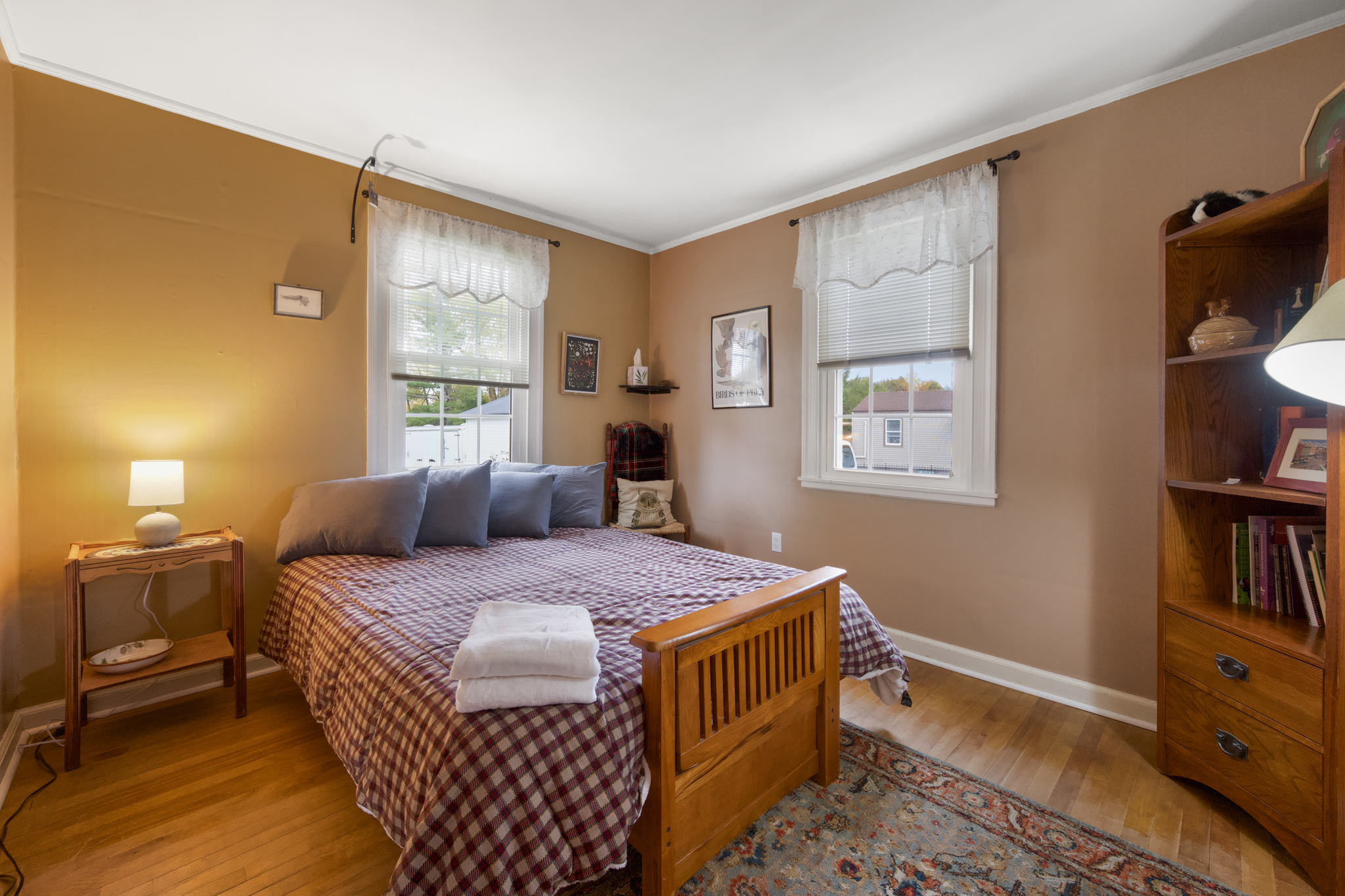 ACCESSIBILITY: Wildlife-themed room with a queen-sized bed, accessible for most guests with only three steps at the front entrance. This floor also includes the vintage-decorated living room, a cozy kitchen, and direct access to the backyard patio.