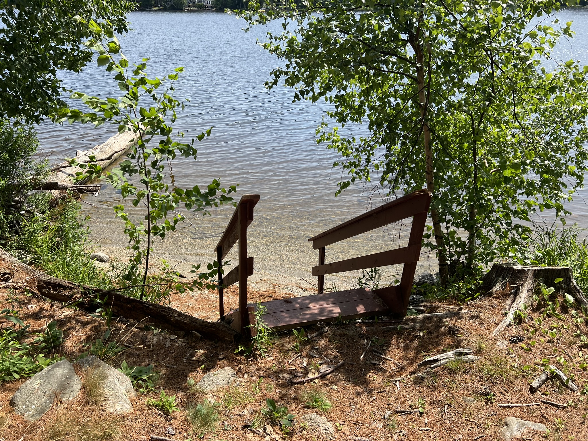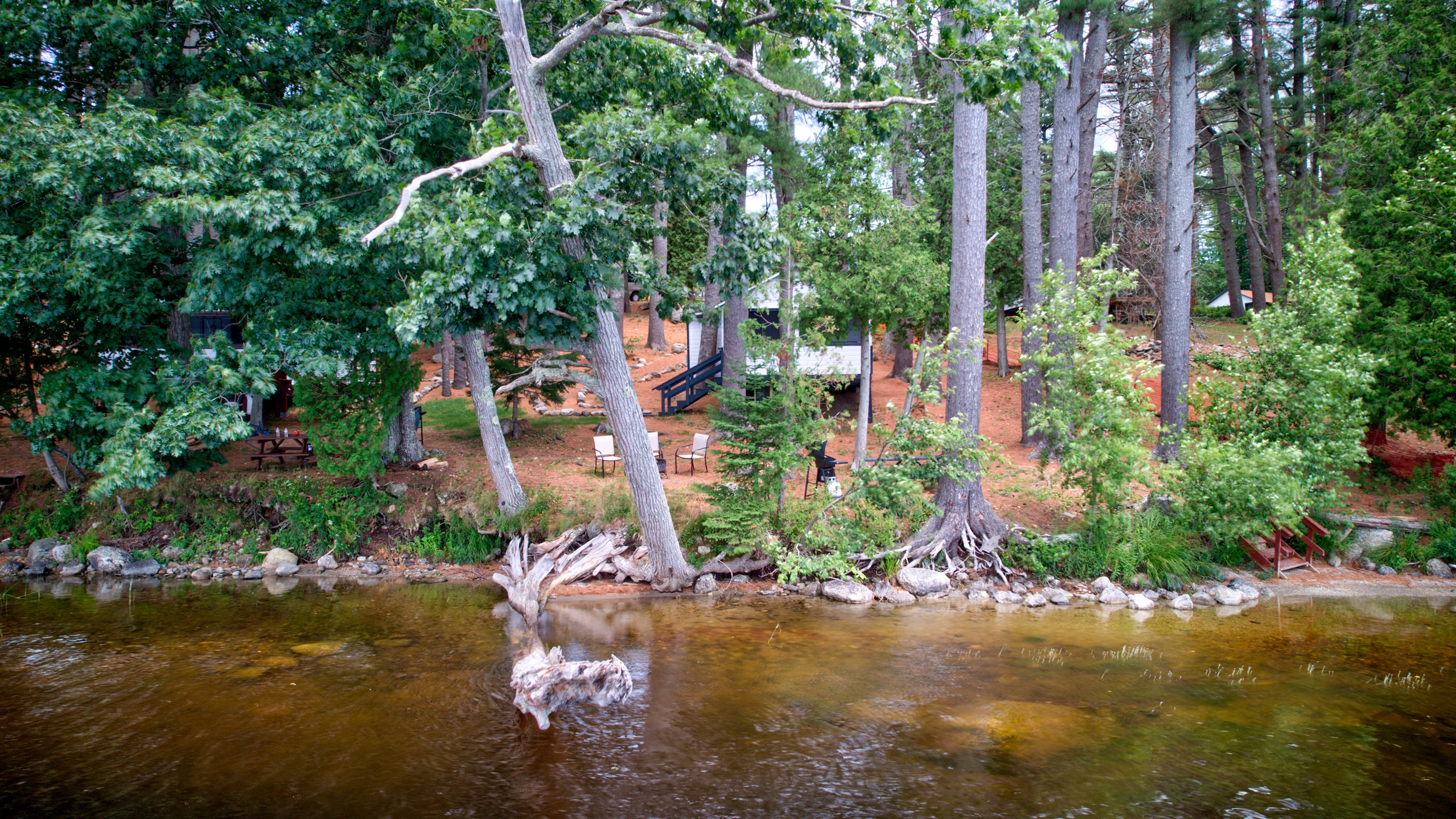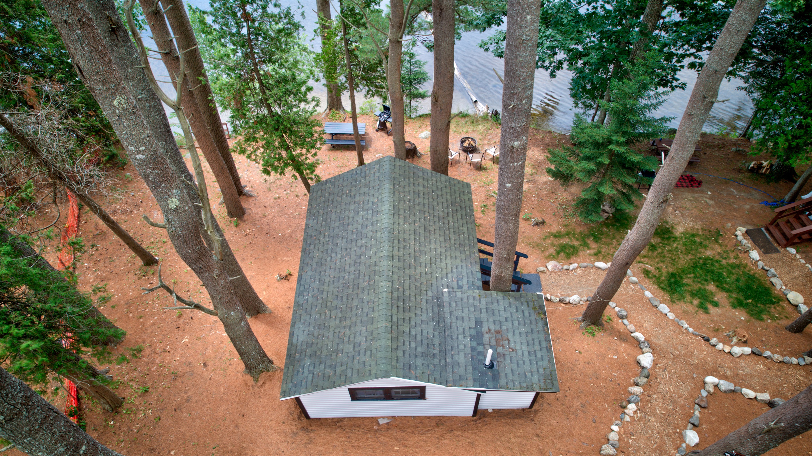 OUTDOOR LIVING: Direct lake access via steep path and staircase to the water, private & expansive yard, fire pit for outdoor campfires (bring your own firewood), a gas grill, 6ft picnic table, Adirondack chairs, beautiful towering pine trees, abundant open space, ample sun and shade