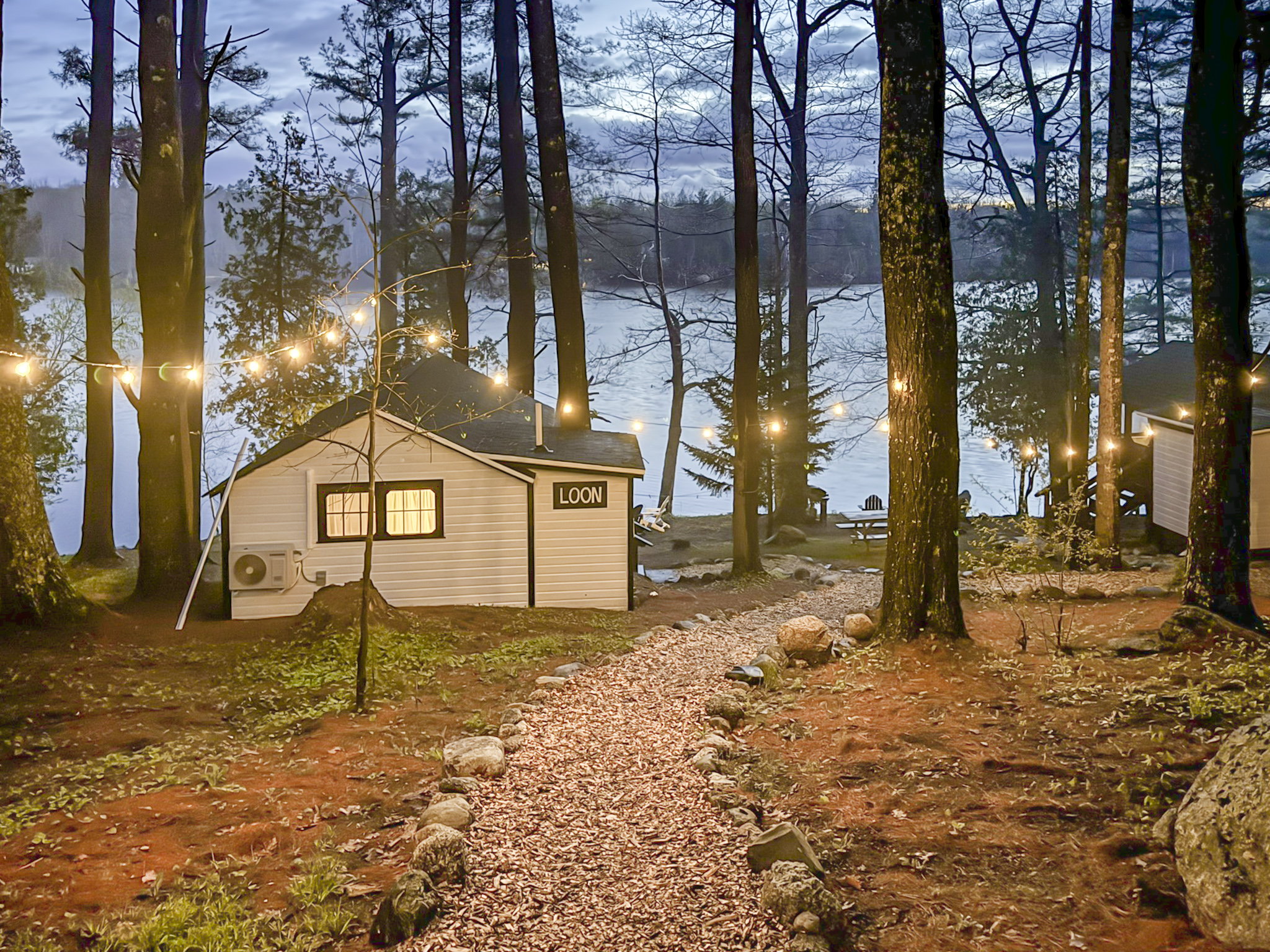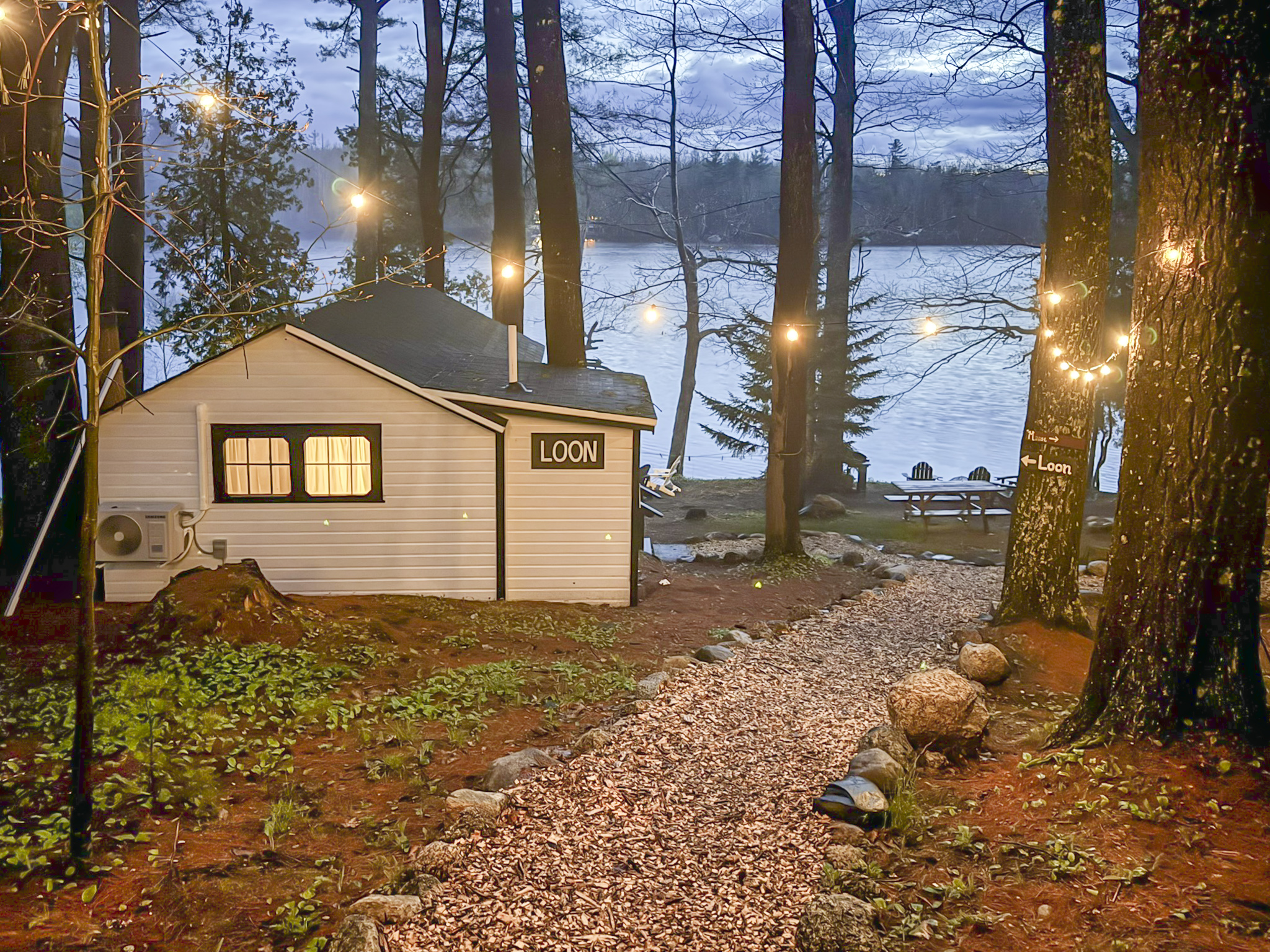 This newly remodeled Maine & Loon themed tiny cabin is nestled among the tall pine tree shoreline of Toddy Pond. The cabin is located in the waterfront row of cabins, as seen on the map in the listing images. You will love this Loon themed tiny cabin! Tucked away in a 9-cabin resort on the beautiful gravel shores of Toddy Pond, you’ll have the opportunity to swim and kayak in the crystal-clear water, relax at the shady picnic tables beneath the towering pine trees, view local wildlife, enjoy at-home necessities, and easily access nearby towns! This is truly a special and unforgettable place! Bring your pets, we are very pet-friendly. You can escape the heat and cold in the cabin with the brand new central air conditioning and heating units.