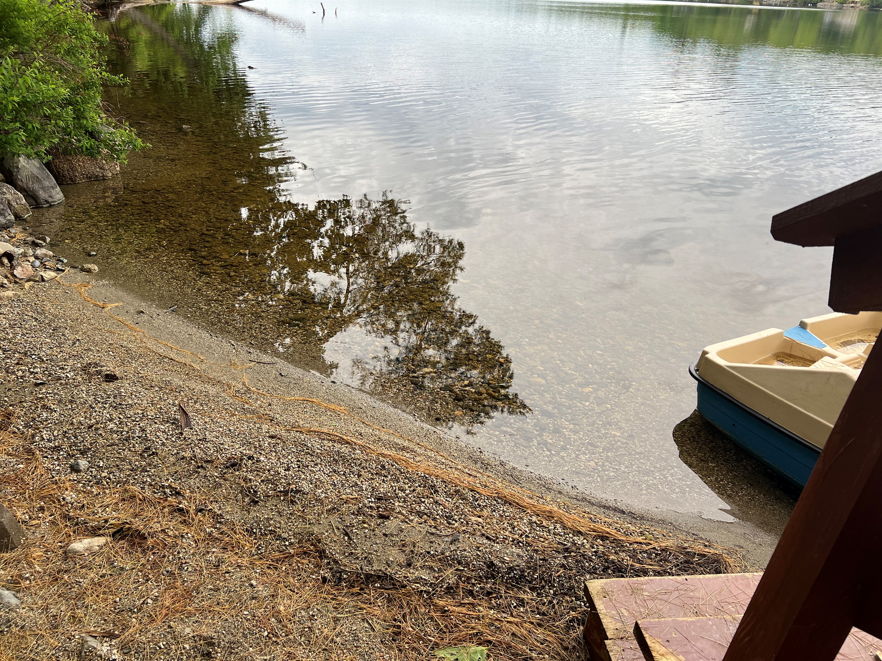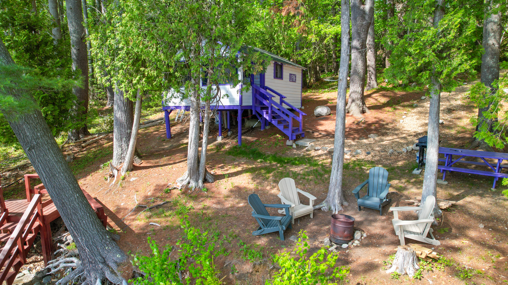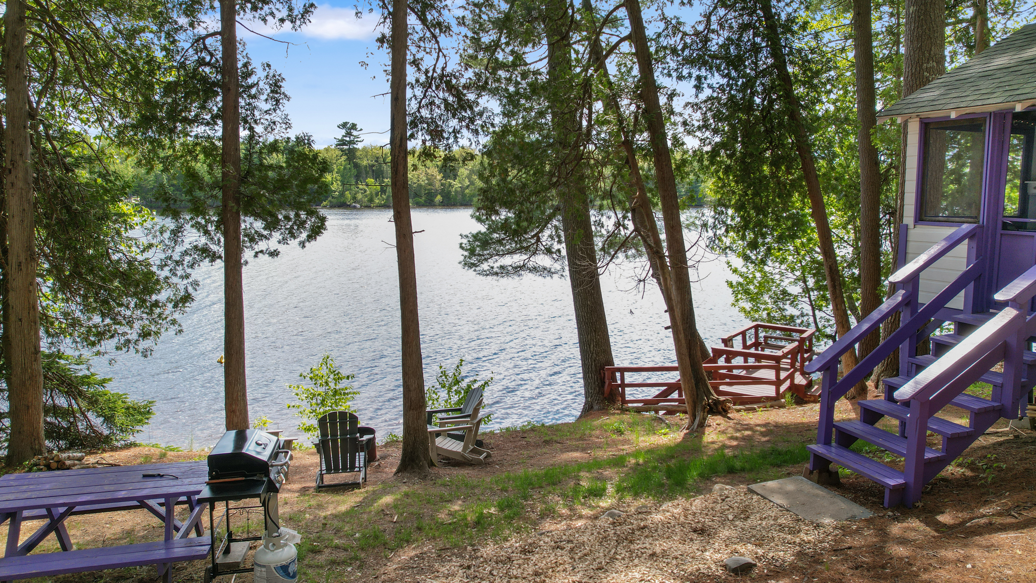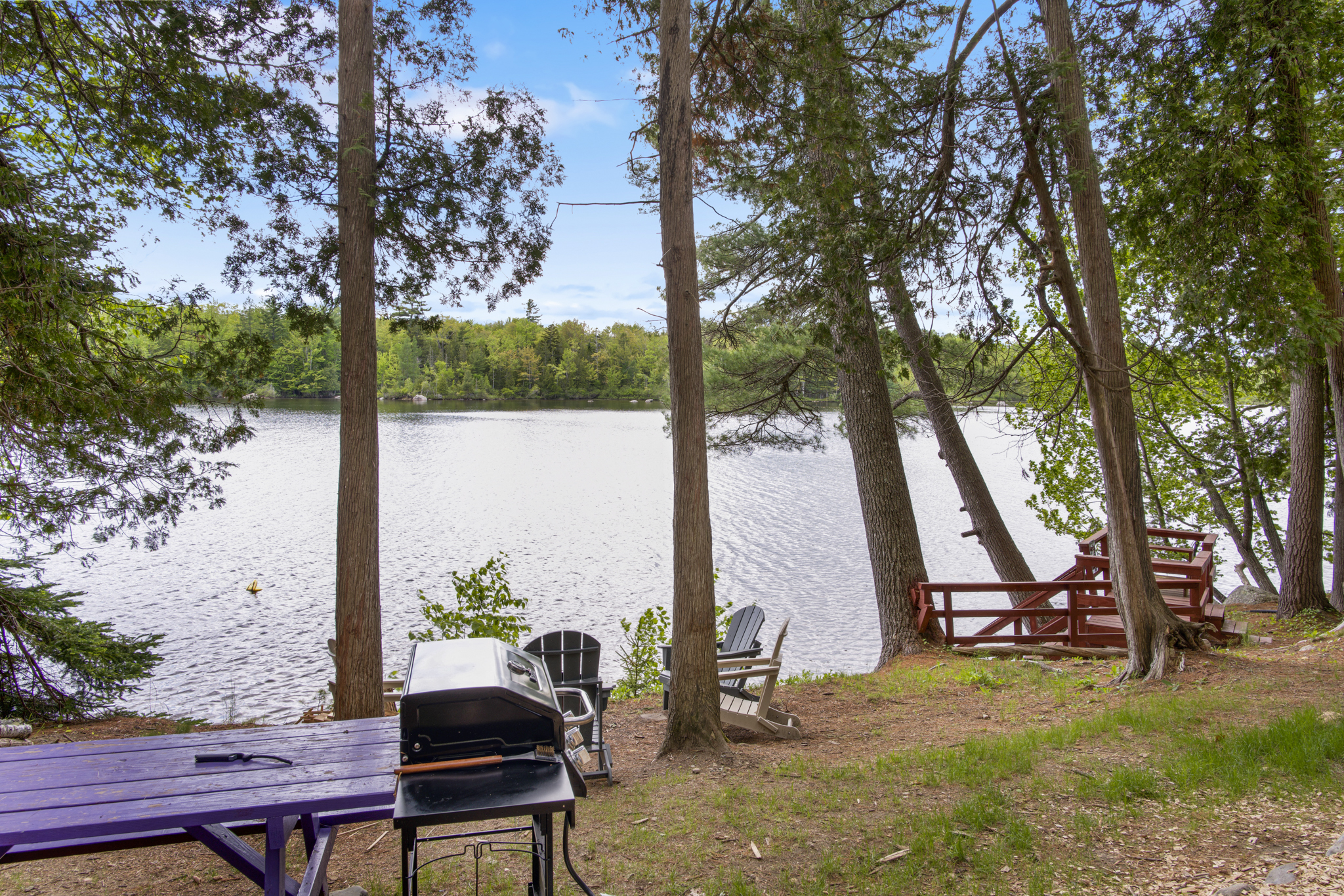 OUTDOOR LIVING: Direct lake access via steep path and staircase to the water, private & expansive yard, fire pit for outdoor campfires (bring your own firewood), a gas grill, 6ft picnic table, Adirondack chairs, beautiful towering pine trees, abundant open space, ample sun and shade