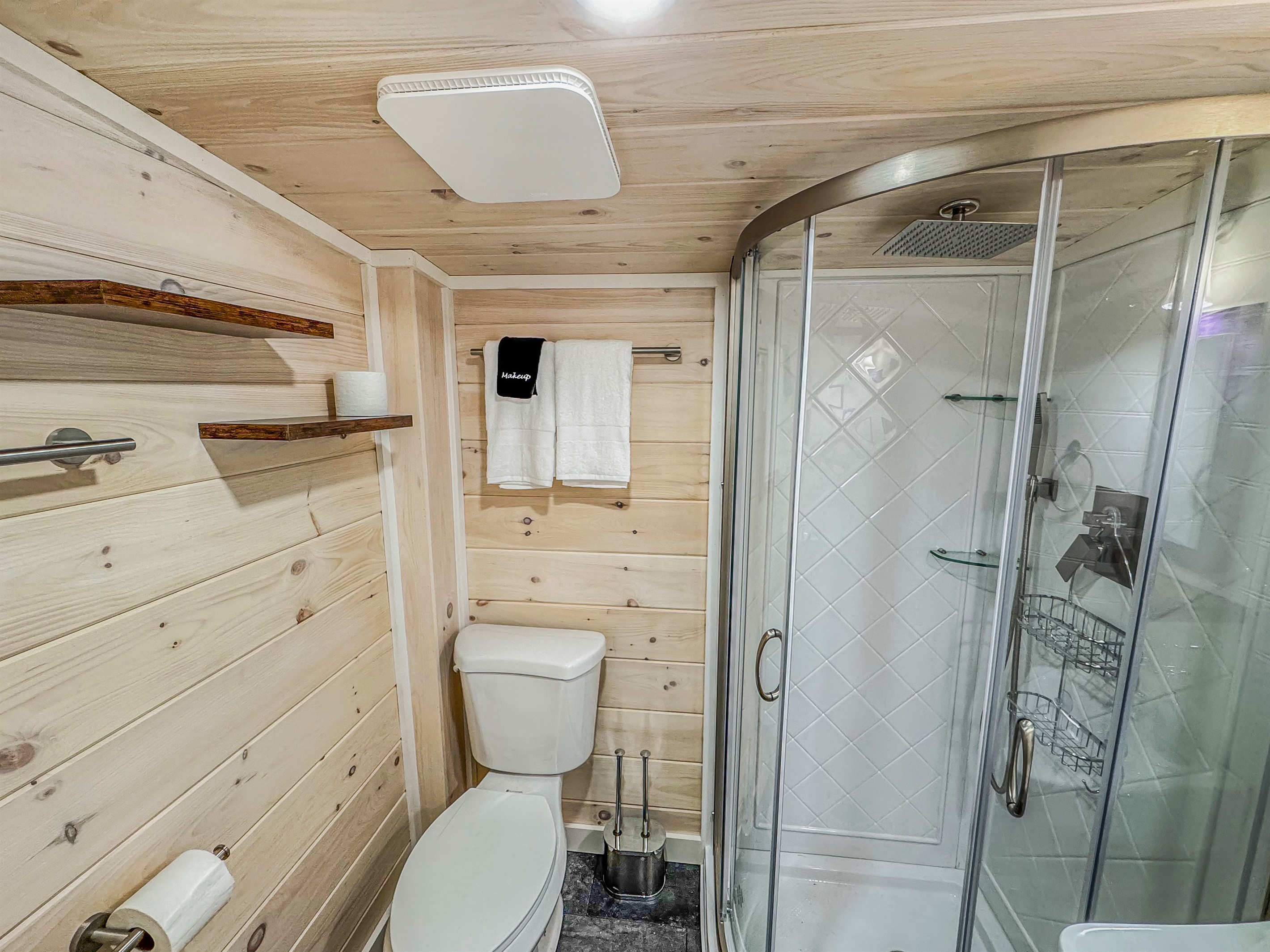 This tiny cabin is 14x14ft wide and has one main room, a bathroom, a screened-in porch, and a yard. On one side, there is a full-size bed and a bunk bed. A kitchenette and a small dining area with two chairs are on the other wall of the cabin. There is an attached and fully remodeled bathroom. The bathroom is small but equipped! Brand-new stand-up shower, toilet, and vanity. Out the front door is a marvelous screened porch with another dining table. Outside is a 6 ft picnic table, a fire pit, a gas grill, and plenty of Adirondack chairs for your group.