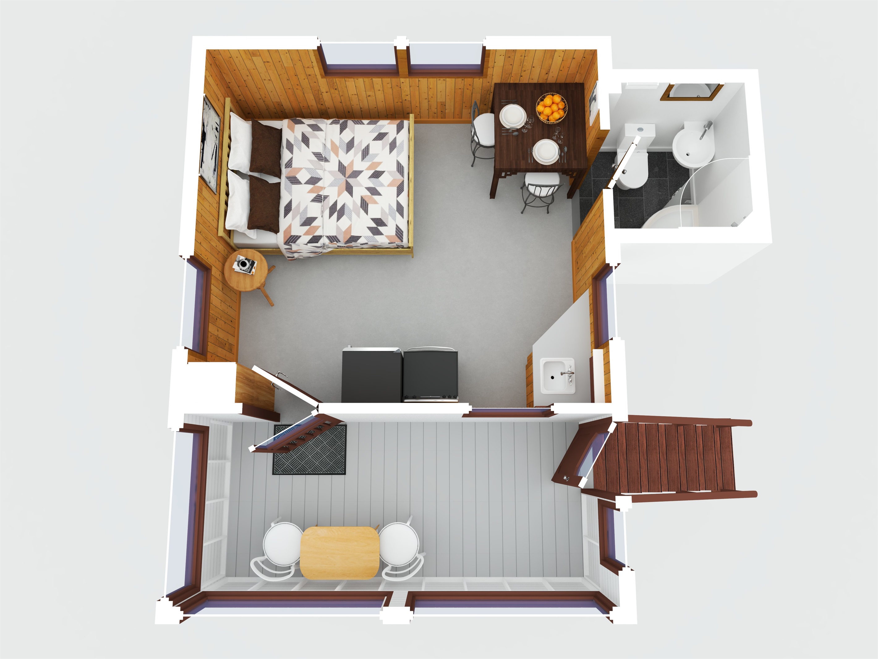 This tiny cabin is 14x14ft wide and has one main room, a bathroom, a screened-in porch, and a yard. On one side, there is a King-size bed. There is a kitchenette and a small dining area with two chairs on the other wall of the cabin. There is an attached and fully remodeled bathroom. The bathroom is small but equipped! Brand-new stand-up shower, toilet, and vanity. Out the front door is a marvelous screened porch with another dining table. Outside is a 6 ft picnic table, a fire pit, a gas grill, and plenty of Adirondack chairs for your group.